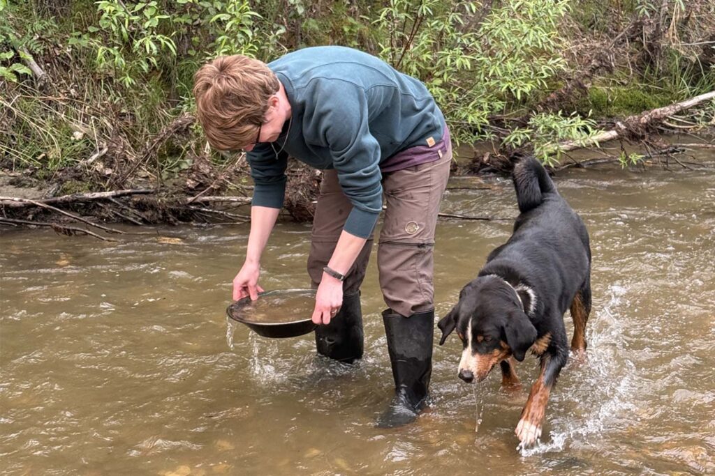 Mit Gummistiefeln stehe ich im Hunker Creek,